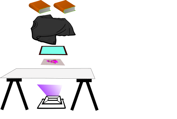 Pour la disposition de tout ceci: on place la plaque de plexiglas entre les 2 tréteaux, sur la plaque de plexiglas on pose le typon, sur le typon on pose le cadre de sérigraphie recouver d’émulsion. Pour éviter des rayonnements extérieurs et pour évider des réflexions de la lumière on pose un tissus noir, par exemple des tshirts épais noirs. Et enfin pour assurer le meilleur contact entre le typon et le cadre on place des poids au-dessus de tout cela (dans mon cas des gros livres)